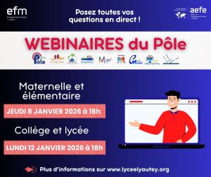 Avant les Journées Portes Ouvertes, qui auront lieu du 15 au 29 janvier 2026, le Pôle Casablanca-Mohammedia propose deux webinaires d’information ouverts à toutes les familles, en présence des chefs d’établissement :